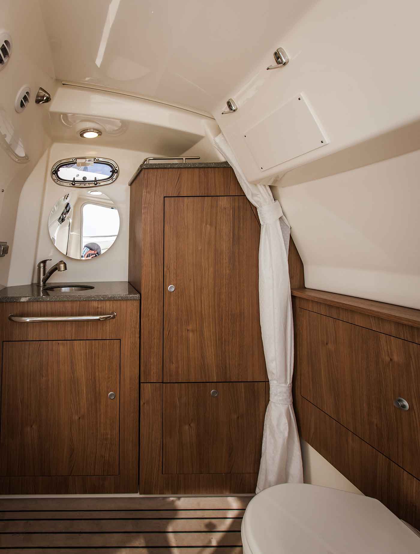 ゆったりとしたバウデッキには、居心地の良いシートと収納があり、コックピットにはのリムーバブルなダイネッティ(オプション)と、家族や友人でボートタイムを楽しめるサマーキッチン(オプション)をしつらえることができます。
