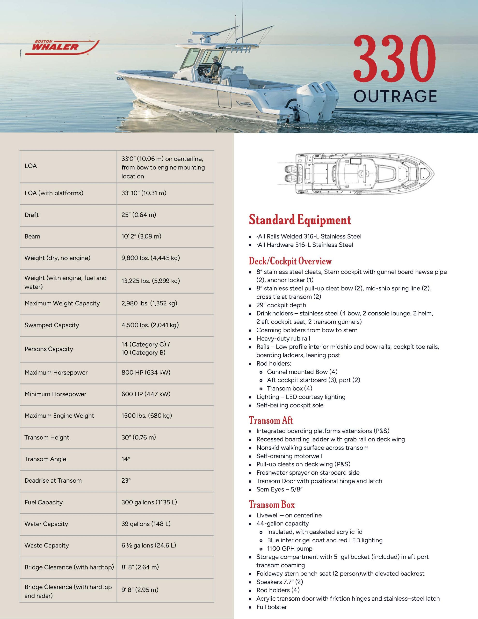 それによると、艇体の基本設計や主ペックは、従来の330アウトレージと変更はなさそうなのです。