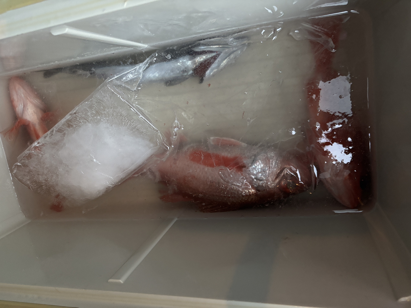 ユメカサゴもいますね。アカムツ、サメに少しかじられちゃってましたが、がっつり持って行かれなくてよかった。