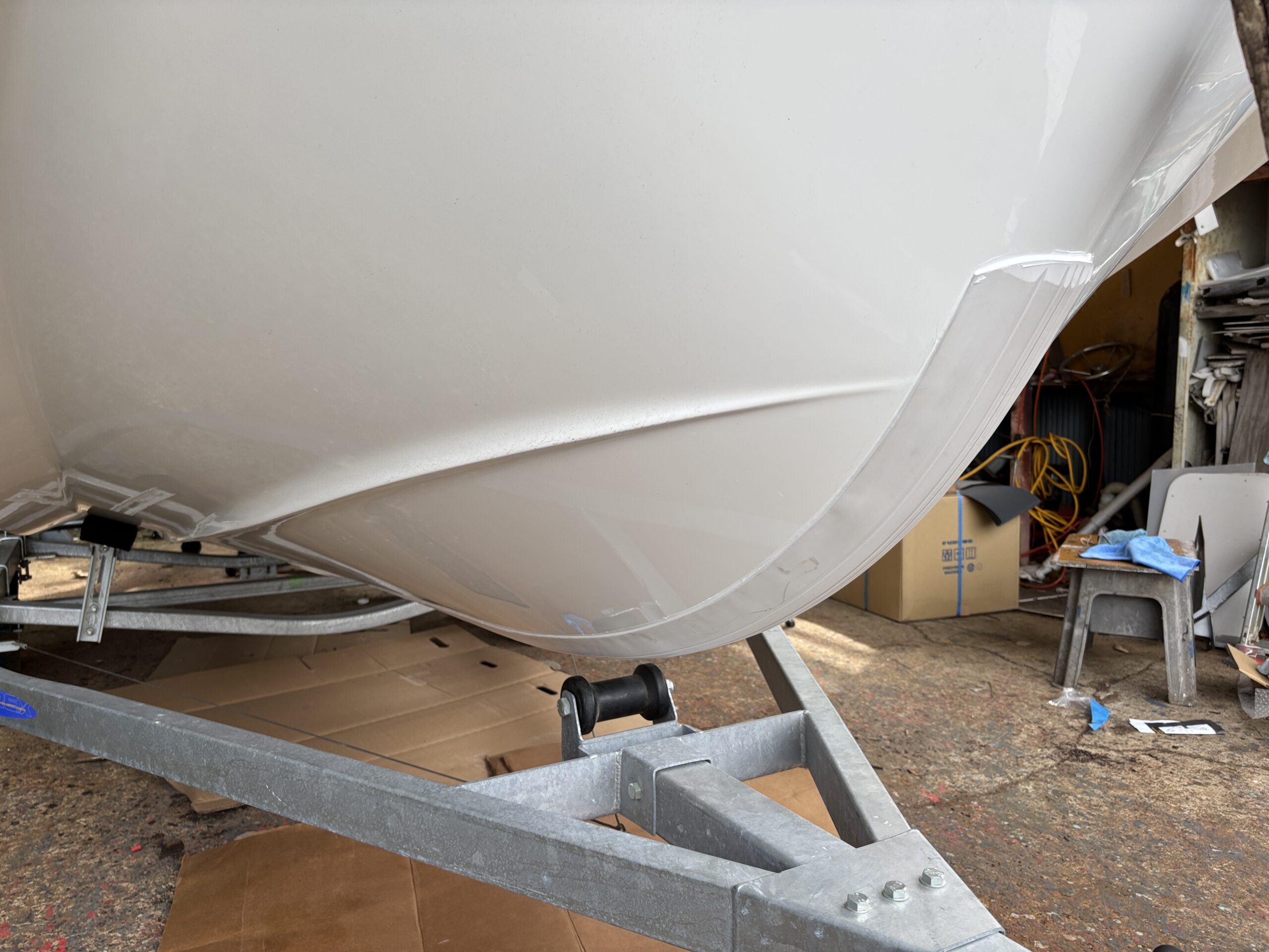 船底中央のキール部分に合わせて貼るのですが、キールガードを貼り付ける前の養生がけっこうたいへんでした。